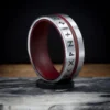 Anneau avec insertion rouge ou bleu, gravé de runes ancestrales. La bande centrale offre un jeu de lecture runique, alliant mystère et élégance dans un design entre glace et lave.