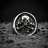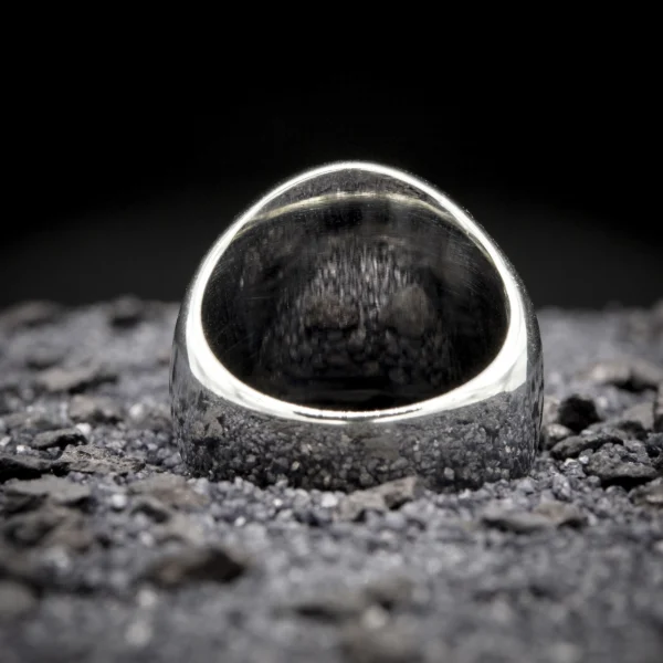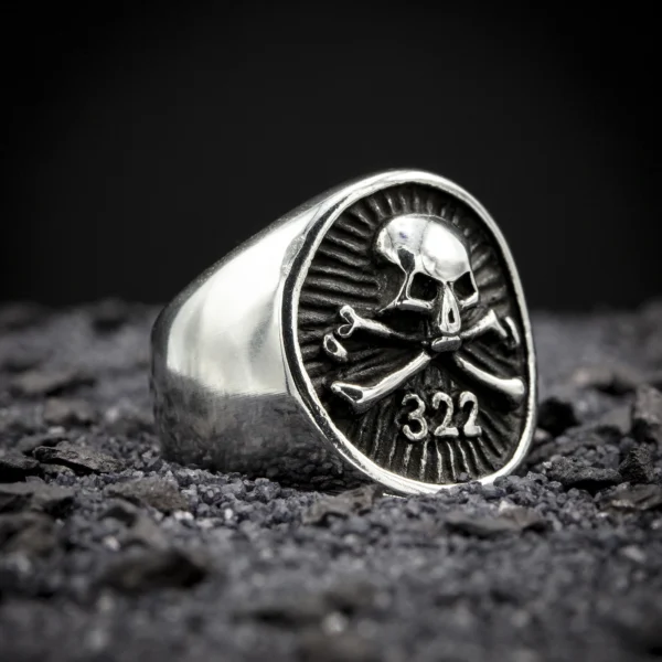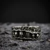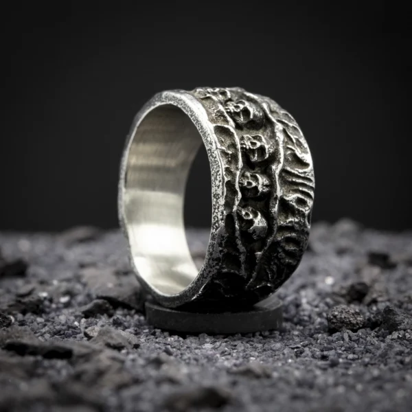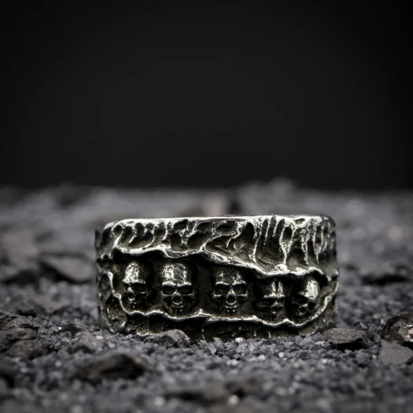 Anneau aux motifs de crâne osseux, comme extrait d’un cabinet d’anatomie victorien. La texture unique et la finition vieillie en font un bijou gothique authentique.