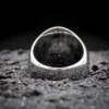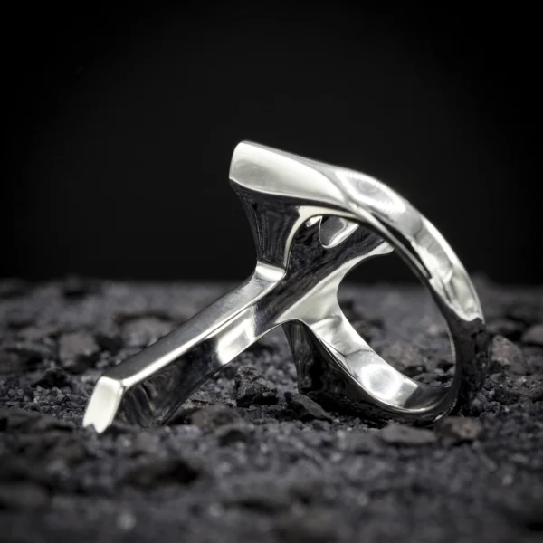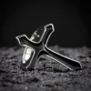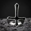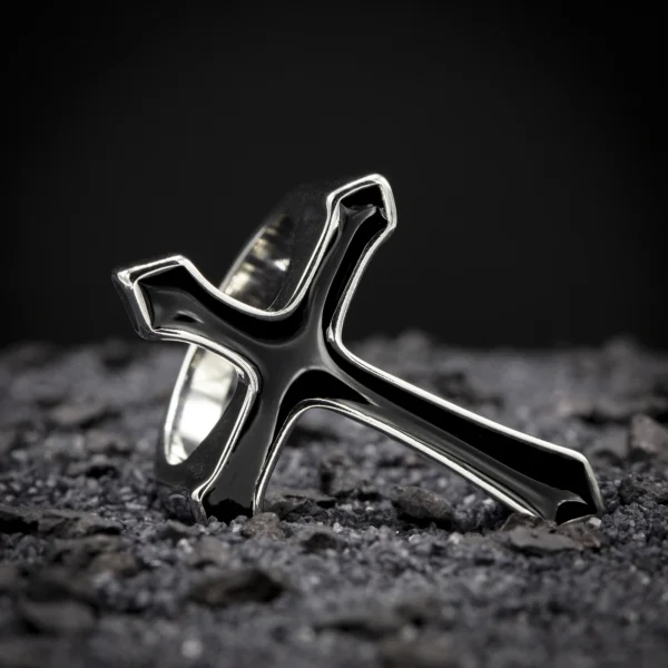 Pièce réunissant anneau et croix ténébreuse, sa finition noire profonde évoque les mystères des anciennes cathédrales gothiques. Les détails et l’aura sombre de cette pièce en font un symbole puissant de l’esthétique gothique traditionnelle.