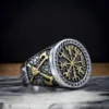 Bague bicolore alliant argent et or, centrée sur une boussole viking Vegvisir. Les détails dorés rehaussent les symboles de protection et de guidance gravés avec précision.