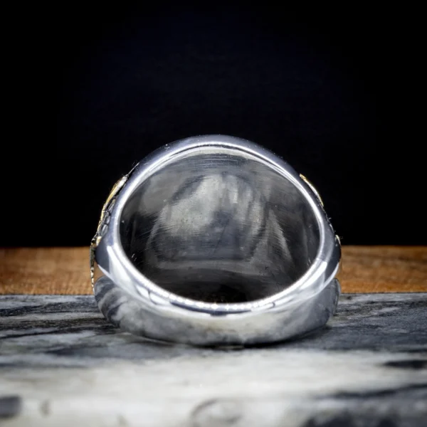 Anneaux majestueux en or et argent orné de runes sacrées. La finition bicolore et les inscriptions évoquent la gloire du Valhalla et la noblesse des guerriers nordiques.