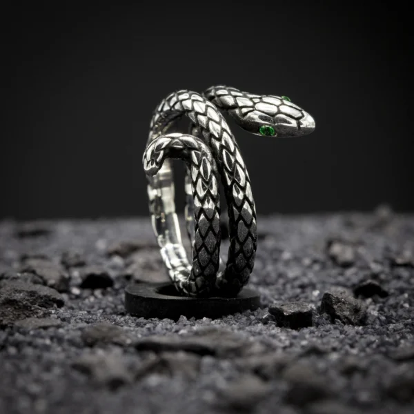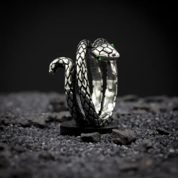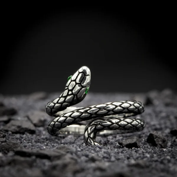 Anneau serpentin aux écailles et à l’enroulement hypnotiques, évoquant les grimoires anciens. Le mouvement sinueux du reptile symbolise la tentation dans la plus pure tradition gothique.