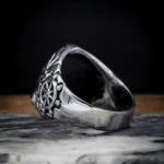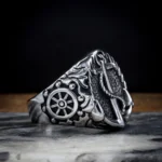Bague imposante mariant avec audace une ancre traditionnelle aux motifs vikings. Les détails ciselés et la finition antique évoquent la puissance des navires dragons dit Drakkar, et l’esprit des raids nordiques.