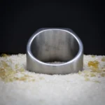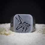 Cette chevalière, où se dessine le portrait d’Anubis, met en évidence le dieu égyptien à tête de chacal, gardien des nécropoles et guide des âmes vers l’au-delà. Un design sobre et mystique évoquant la protection divine et le voyage spirituel, entrelacé d’un coté comme de l’autre de la célèbre croix d’Ankh, rendant hommage à la puissance et à la solennité d’Anubis dans la mythologie égyptienne.