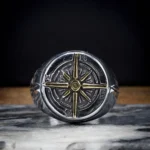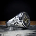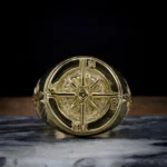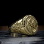Bague ornée d’une étoile cardinale à 8 branches dorée rayonnante. Les points cardinaux sont des points de l’horizon qui servent à s’orienter sans se perdre en mer. Avis au marin d’eau douce!