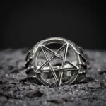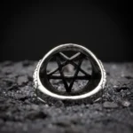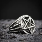 Bague rituelle au pentagramme saisissant serti de griffes acérées. Son design épuré et sombre en fait un accessoire parfait pour tout amateur de cet univers.